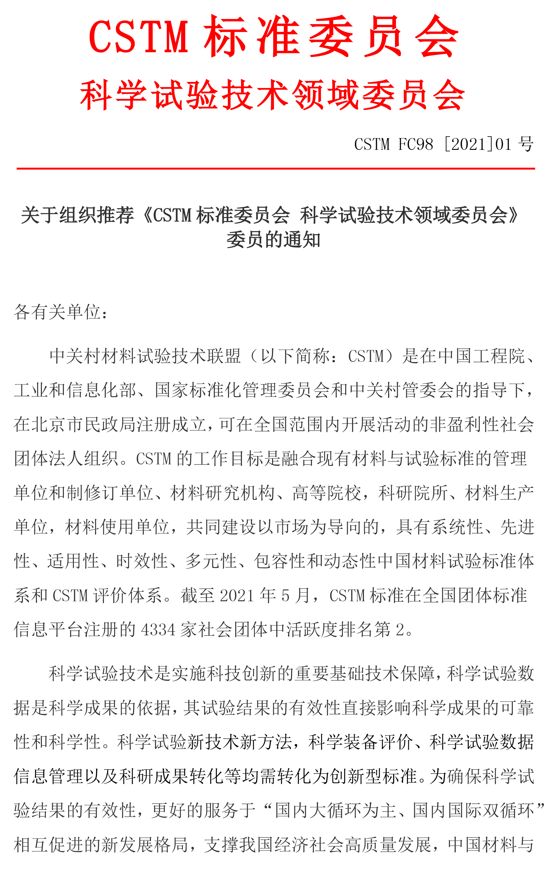 关于组织推荐《CSTM标准委员会 科学试验技术领域委员会》委员的通知