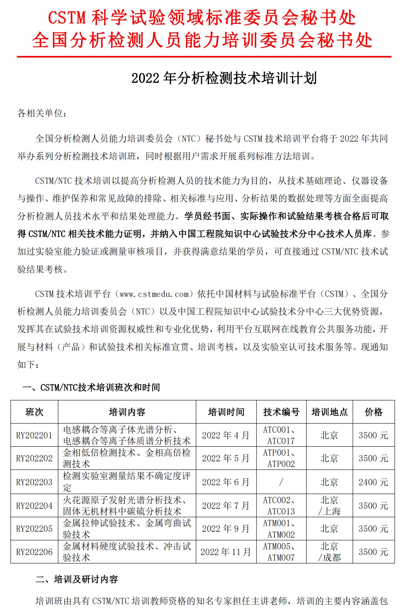 2022年分析检测技术培训计划