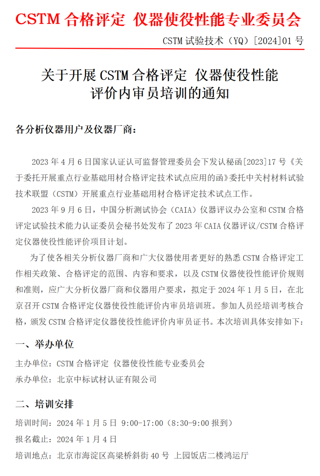 关于开展CSTM合格评定仪器使役性能评价内审员培训的通知