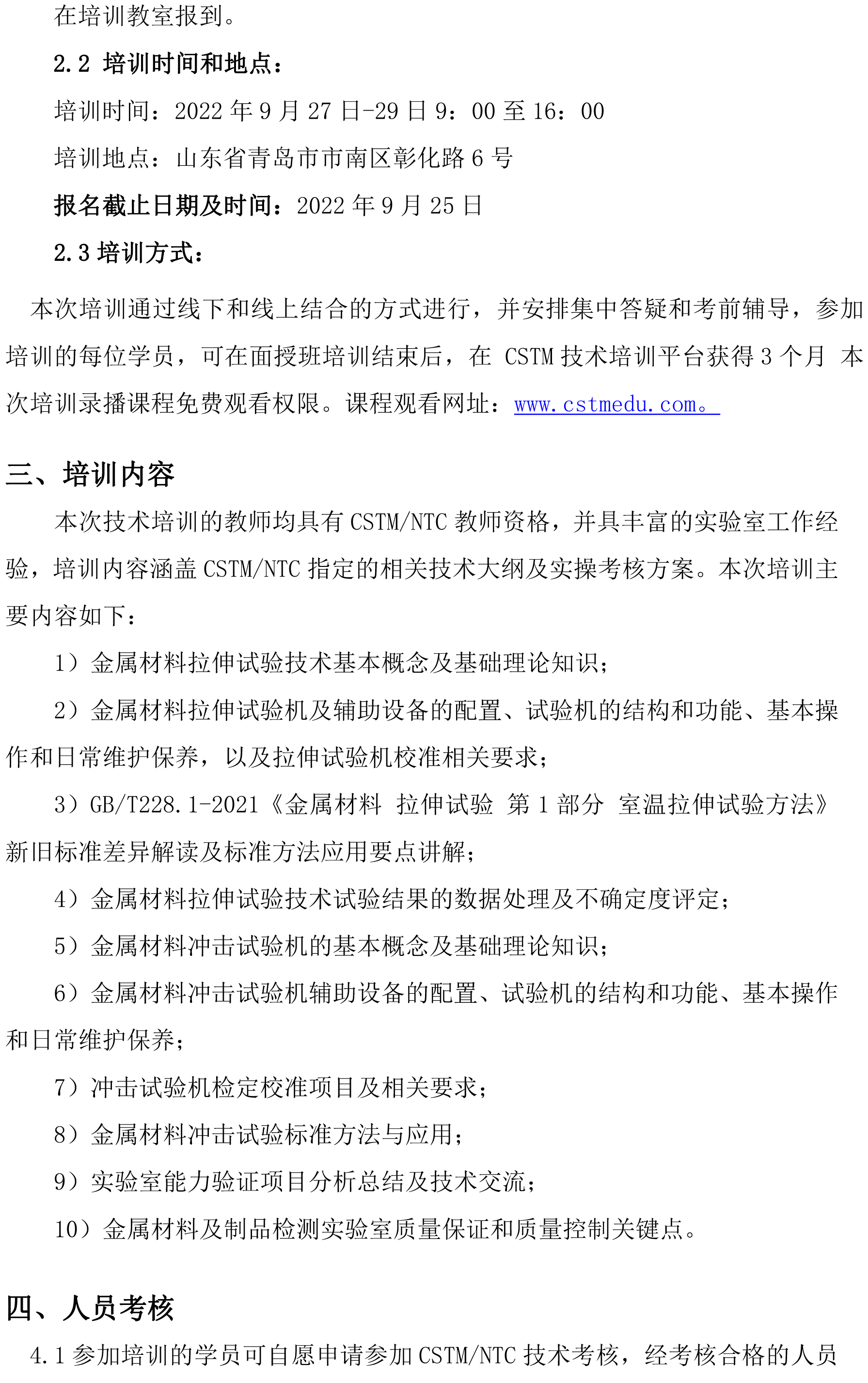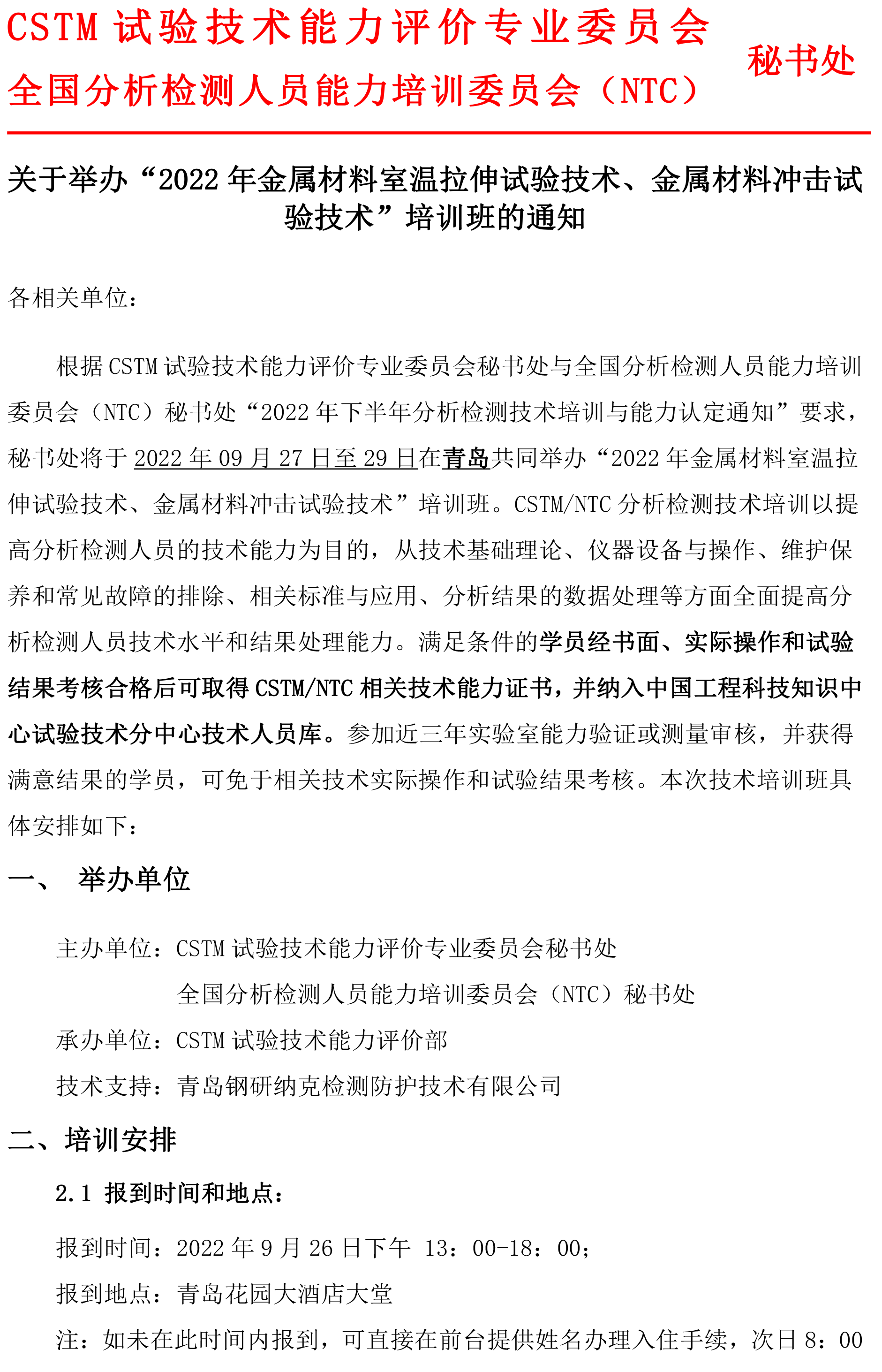 关于举办“2022年金属材料室温拉伸试验技术、金属材料冲击试验技术”培训班的通知
