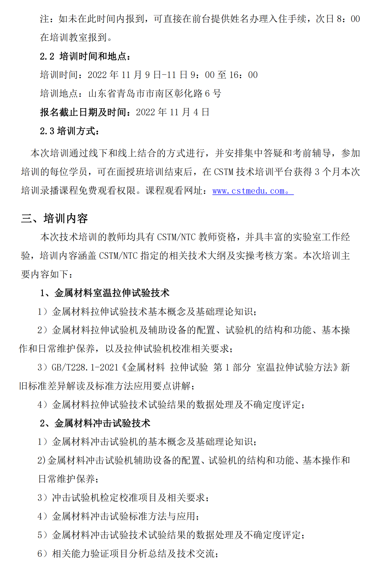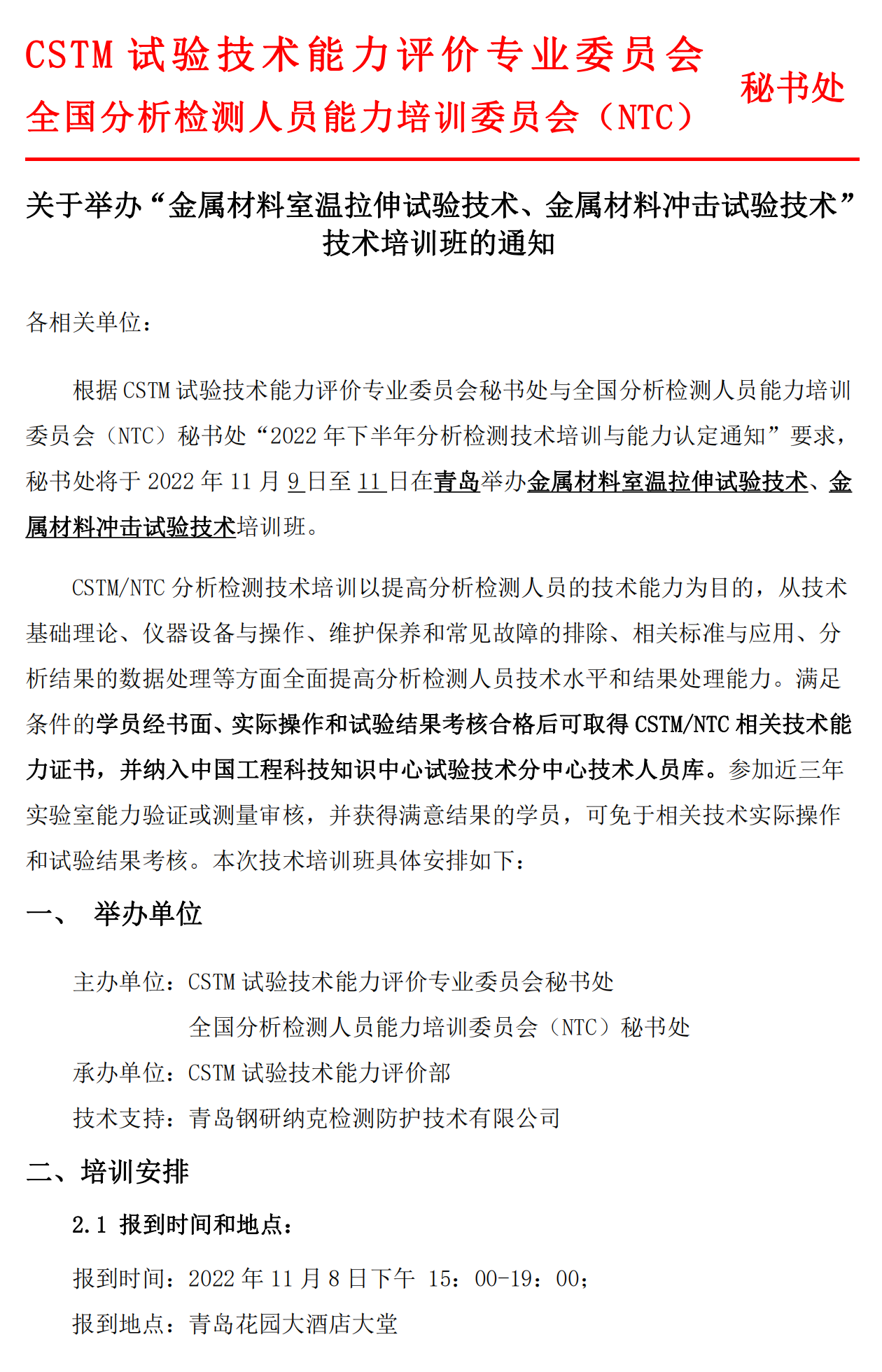关于举办“金属材料室温拉伸试验技术、金属材料冲击试验技术”技术培训班的通知