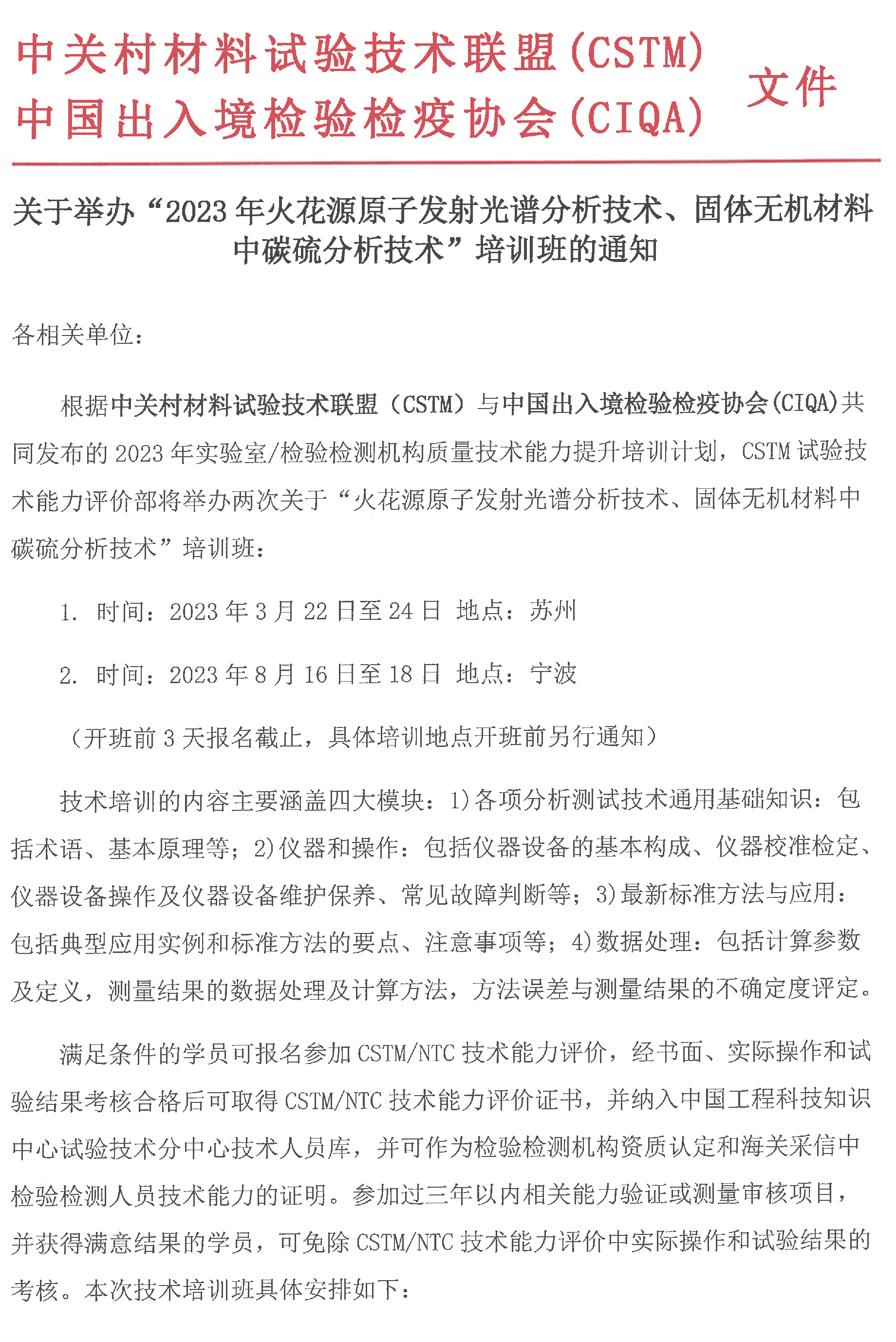 关于举办“2023年火花源原子发射光谱分析技术、固体无机材料中碳硫分析技术”培训班的通知