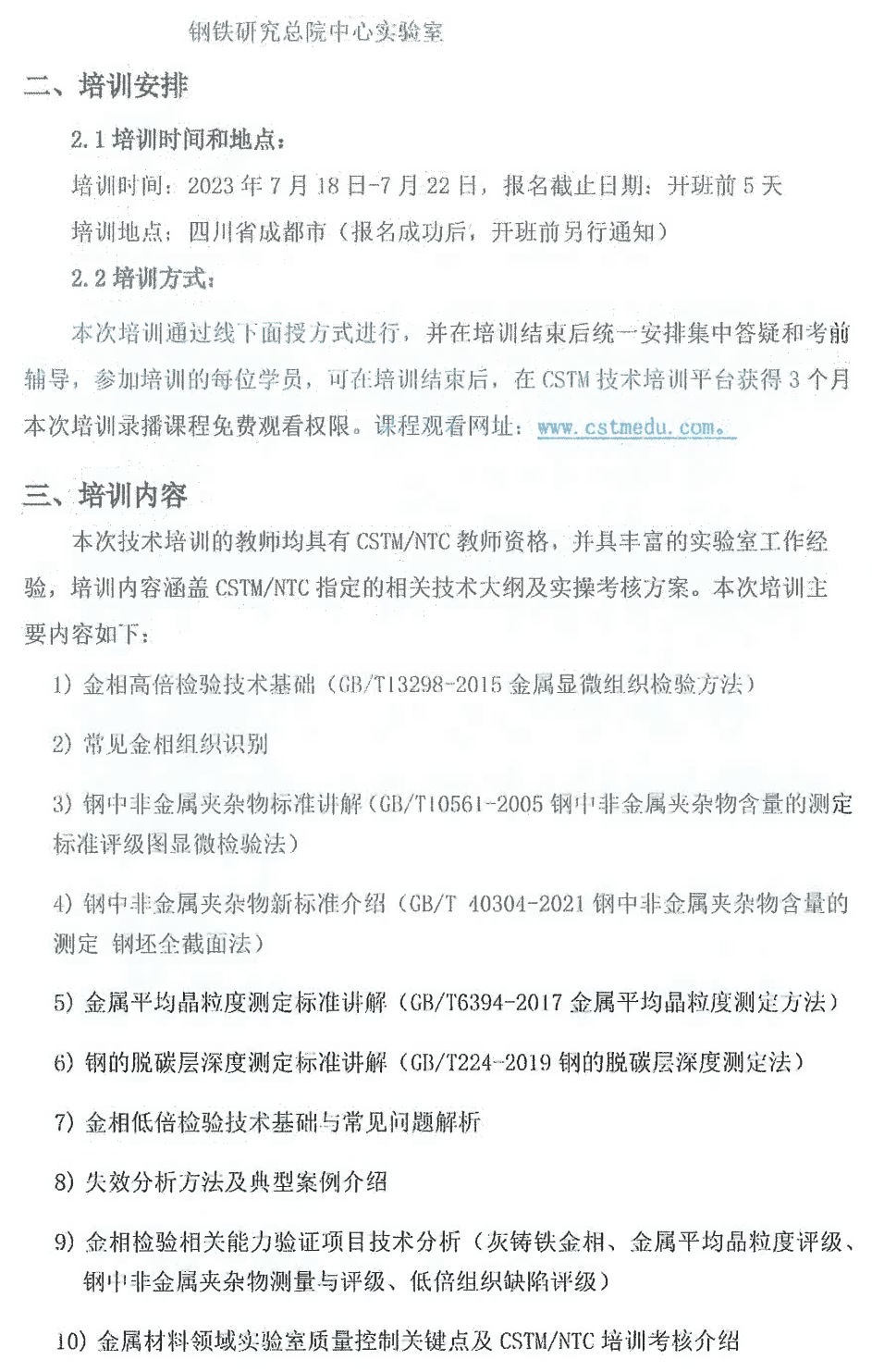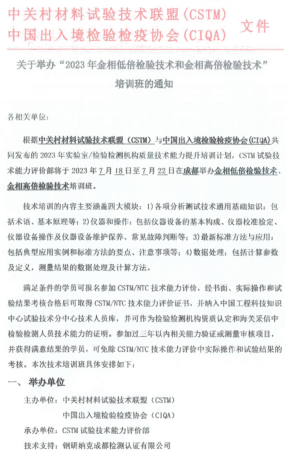 关于举办“2023年金相低倍检验技术和金相高倍检验技术”培训班的通知