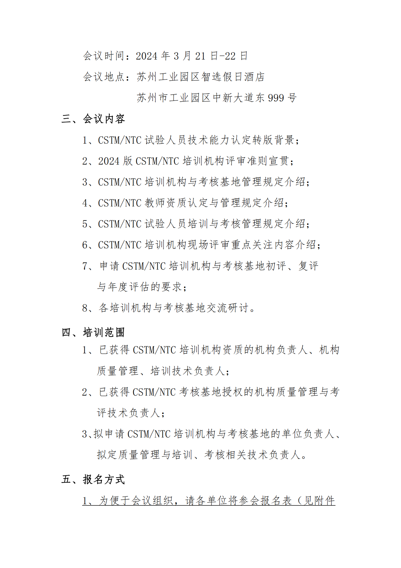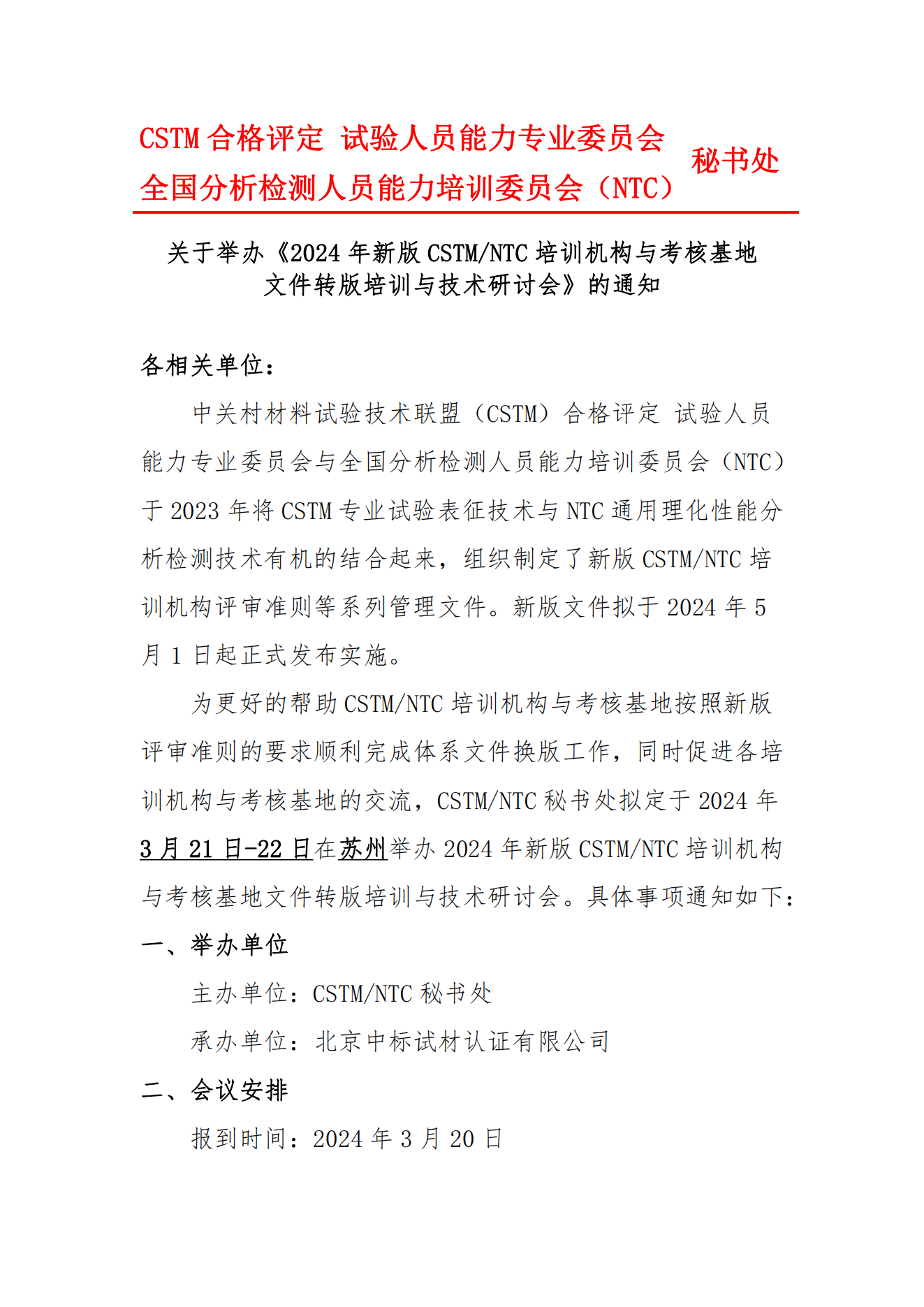 关于举办《2024年新版CSTM/NTC 培训机构与考核基地文件转版培训与技术研讨会》的通知